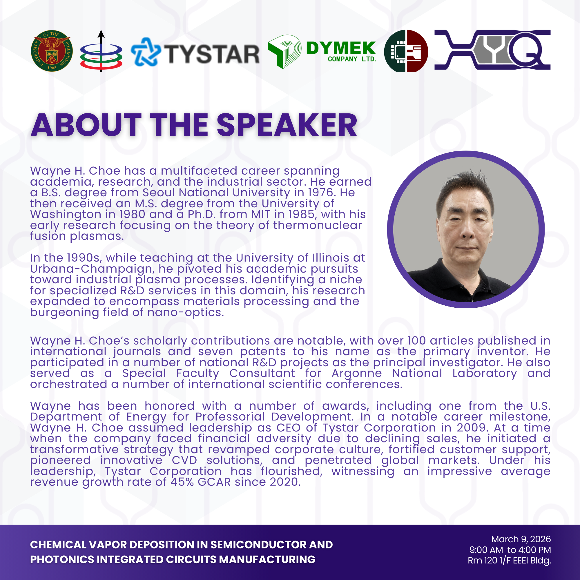 Garden Grove, CA – May 29, 2025 — Dr. Wayne H. Choe, CEO of Tystar Corporation and a recognized expert in semiconductor process technologies, recently completed a series of lectures on Low Pressure Chemical Vapor Deposition (LPCVD) Processes during his visit to India and Singapore. Dr. Choe delivered his widely respected lecture series at the following prestigious institutions: